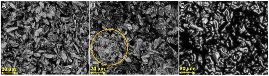 Microscopic images of silk particles illustrating no particle fusing ((A)—40 wt.% formic acid as a binder), some particle fusing ((B)—75 wt.% formic acid as a binder), and majority of particle fusing ((C)—99 wt.% formic acid as a binder). Yellow circle showing a blotch of silk particle fusing with 75 wt.% formic acid as a binder.