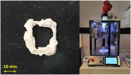 With the preliminary investigations into silk powder behavioural characteristics and the development of a particle binding method, an in-house custom-built 3D printer was designed and manufactured (Figure 13). Figure 13 shows an initial printed construct developed solely from silk powder. The design and evaluation of the silk 3D printer and initial printed construct are outside of the scope of this paper. This work is present elsewhere [31].