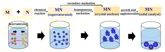 The synthesis of (nanoscale) solid catalysts is largely based on wet chemical methods both in batch reactors and in microfluidic synthesis fields, which includes three stages: firstly, the reactant molecules are (uniformly) mixed (i.e., the micromixing process); secondly, a chemical reaction occurs to form a supersaturated solution; thirdly, the precipitate is formed in the crystallization process including nucleation, growth and agglomeration (Figure 1) []. The precipitate becomes the solid catalyst typically after filtering, washing, drying, and calcination/reduction process. When the concentration of the target product reaches supersaturation in the solution, it will be deposited by homogeneous or heterogeneous nucleation. During the precipitation process, the nucleation, growth and agglomeration of crystals have a great influence on the product particle size and morphology []. In order to generate non-agglomerated particles with a narrow particle size distribution, it is required that all nuclei are formed nearly simultaneously, and no secondary nucleation or particle agglomeration occurs during the subsequent crystal growth process. The particle size and its distribution and morphology of the target product depend on the relative rates of nucleation, crystal growth and agglomeration kinetics [], which are therefore influenced by reaction conditions (temperature, concentration, solvent composition, pH, etc.) [,]. The morphology, size and structure have a significant impact on the physical and chemical properties of catalyst particles, which in turn affect their catalytic performance []. Therefore, it is of great significance to study the preparation method of catalysts to improve their catalytic activity and selectivity.