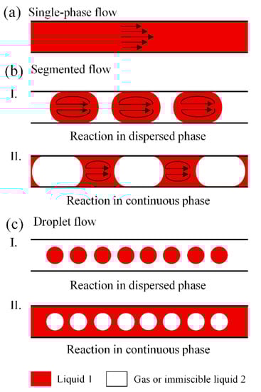 According to the flow pattern manipulation during solid catalyst synthesis, microfluidic methods can be divided mainly into two types, namely single-phase flow (continuous flow, Figure 3a) and two-phase flow methods []. The two-phase flow method can be subdivided into gas-liquid/liquid-liquid segmented flow (Figure 3b) and liquid-liquid droplet flow (Figure 3c) methods. The length of droplets (if present) in segmented flow is larger than the microchannel diameter and there is usually a film present between the droplet and microchannel wall, while the droplet size is smaller than the microchannel diameter in the droplet flow mode and droplets are surrounded by the continuous liquid phase. In both biphasic flow modes, reactions can occur either in the dispersed phase (Figure 3bI,cI) or in the continuous phase (Figure 3bII,cII). In general, for reactions that are prone to blockage, reagents are usually confined in the dispersed phase, and the generated solid particles are prevented from contacting or interacting with the microchannel, thereby clogging can be prevented. Both single- and two-phase flow methods are characterized by low Reynolds numbers (and thus laminar flow conditions) due to small microchannel sizes, but the mixing behavior of reagents is largely different. The mixing of reagents in microreactors under single-phase flow operation is relatively slow and primarily driven by molecular interdiffusion, whereas reagents under two-phase flow operation can be more efficiently mixed (e.g., on sub-millisecond timescales) through the strong advection generated in droplets [].