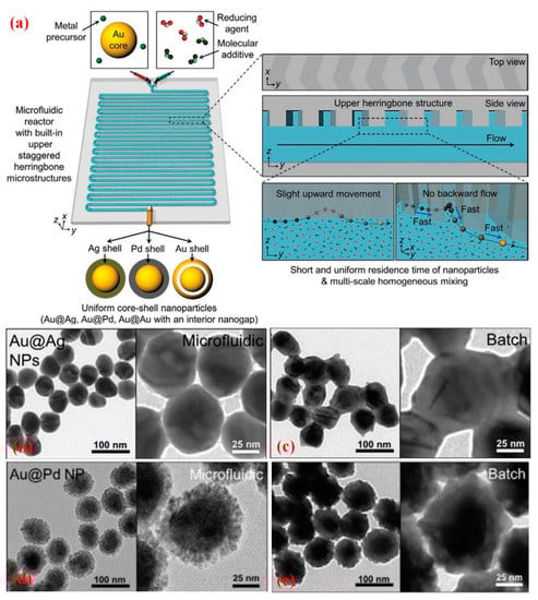 By combining two metals, the properties of the resulting nanoparticles may differ from those of pure metals due to the interaction between metal particles. The bimetallic particles often form alloys or core-shell structures and usually exhibit an excellent catalytic performance because of the synergistic effect of metal atoms []. For example, Au@Ag core-shell nanoparticles were synthesized (using HAuCl4 and sodium citrate for the synthesis of Au core, and AgNO3 and ascorbic acid for the preparation of Ag shell) in a single-phase microreactor (Figure 5a) and a conventional batch reactor, respectively []. Compared with the batch results, the spherical Au@Ag core-shell nanoparticles synthesized in the microreactor exhibited a more uniform shell size (Figure 5b,c) due to the faster mixing of reagents and better control over the reaction time. Moreover, the microreactor could be used to produce various uniform core-shell nanoparticles, such as Au@Pd (Figure 5d), Au@Au, and Au@Au with an interior nanogap. Hybrid Au-Pd dumbbell-like nanostructures, which involved the synthesis of Pd nanorods using Na2PdCl4 as precursor and ethylene glycol as reducing agent and solvent, as well as the growth of Au on Pd nanorods using HAuCl4 as precursor and ethylene glycol as reducing agent, were successfully synthesized (Table 2) []. In more detail, Pd nanorods were synthesized in a sequential-addition microfluidic reactor by segmented flow method, and the growth of Au was conducted in an ultrasonic integrated microfluidic reactor by single-phase flow method. Core@shell Au@Pd nanostructures with controlled shape and dimensions have been obtained in a continuous flow droplet microreactor, including the synthesis of Au core (using HAuCl4·3H2O as precursor, NaBH4 or sodium citrate as reducing agent) and the growth of Pd shell (using H2PdCl4 as precursor, L-ascorbic acid as reducing agent, and silicone oil as the carrier medium) (Table 3) []. The droplet-based microreactor further enabled the inline analysis and modification of process conditions compared with the batch method.