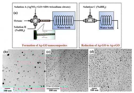 (a) The microreactor system for the synthesis of Ag-rGO composites. The system can be divided into two stages: (1) the deposition of Ag nanoparticles onto GO sheets, (2) the reduction of Ag-GO composites to Ag-rGO composites; (b) TEM images of Ag-rGO synthesized in the batch reactor; (c,d) TEM images of Ag-rGO synthesized in the microreactor at relatively low (c) and high (d) Ag loadings. Reproduced with permission from reference [].