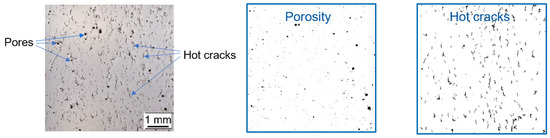 The defect density was determined using image analysis. The cross sections parallel to the building direction were prepared by standard metallographic procedures including mounting, grinding, and polishing, and 16 optical images of each sample were taken with a magnification of 250 times to combine an overview of the cross section. Under this magnification, all defects can be clearly observed. These overviews were used for the density determination with the software ImageJ [35]. In this study, defects were separated into pores and hot cracks according to their circularity above or below 0.35, respectively. Cold cracks which typically appear at the surface of large components were not observed. Figure 2 presents an example of the defects in an optical overview separated into pores and hot cracks.
