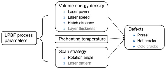 The LPBF process parameters in this study can be divided into three groups, volume energy density (VED), preheating temperature, and scan strategy, as illustrated in Figure 3. All of these parameters influence the relative density of as-built parts.