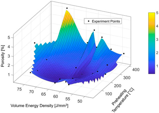 Three types of porosity are observed in LPBF: gas porosity, keyhole porosity, and lack-of-fusion porosity [6]. To achieve high densities, process parameter optimization, in particular laser power (P) and laser speed (v), has been intensively investigated [6,8,9,10,11,12,13,14]. In these studies, the process window described in P vs. v maps are typically plotted. With high laser speed and low laser power, the low energy density area leads to insufficient melting and lack-of-fusion defects. In detail, lack-of-fusion appears if the overlap between melt pools is not sufficient to ensure the melting of all particles [15]. In contrast, the high energy density area causes balling and keyhole pores. Therefore, the medium energy area in the laser processing map is selected as the process window to produce parts with high relative density and without the above defects. Overall, a stable melting pool is critical to minimize defects, and highly dense components require relatively high energy input while avoiding keyholes [16]. As another high energy input source, a preheated powder bed can improve the printability of alloys [17,18,19,20,21]. However, only the optimal parameters were considered within these studies. The interaction of preheating temperatures with laser parameters has rarely been illustrated.