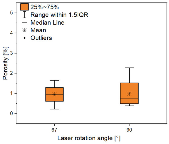 The laser scan rotation angle between the layers resulted in the rotation of heat flux and thus the alternation of the melting pool. Theoretically, a scan rotation of 67° leads to a more even temperature gradient and better fusion of the particles. Therefore, relatively homogeneous microstructure and mechanical properties have been reported with this kind of scan rotation [37,38,39]. As for porosity, a scan rotation of 67° can enhance densification during LPBF [38]. However, in our study, as shown in Figure 6, these two scan rotations result in similar average porosity values but with slightly less scatter with 67° laser rotation.