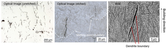 Solidification and liquation cracking are well known from welding processes. Solidification (hot) cracks form in the melting pool and often reveal the dendritic morphology, whereas liquation cracks normally form in the heat-affected zone [40]. In the as-built parts, cracks can be detected from the cross-section, as shown in Figure 7. The melting tracks and dendritic solidification microstructure are revealed after etching. These cracks are located in the middle of the melting pool parallel to the building direction, which confirms their formation during solidification. Solidification cracking occurs at the final stage of solidification, where dendrites have grown almost fully into grains that are separated by a grain boundary liquid film, as illustrated in the back scattered electron (BSE) image.