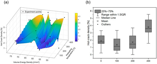 (a) Hot crack density of samples versus volume energy density and preheating temperature. (b) Statistical analysis of the hot crack density of samples built with different preheating temperatures.