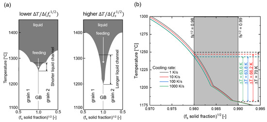 (a) Schematic illustration: effect of on liquid feeding at the grain boundary. (b) The comparison of crack susceptibility with different cooling rates by calculated vs. curves.