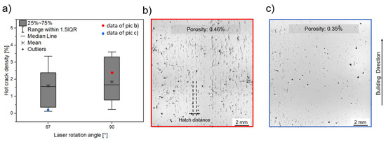 The statistical analysis of the hot crack density of parts built with 67° or 90° laser rotation angles is presented in Figure 10a, where samples built with the same process parameters but different laser rotation angles are compared. Considering all of the experimental data, there is no significant difference in hot crack density between the two rotation angles. However, for the optimized parameter sets with low porosity, the laser rotation angle of 67° leads to fewer hot cracks, which can be observed in the cross-sections in Figure 10b,c. With a scan rotation of 90°, hot cracks align with a distance corresponding to the hatch distance because the laser melted at the exact same position every two layers, and hot cracks always formed in the center of the melting pool. The scan rotation of 67° can avoid this repetition. Therefore, the parts built with the 67° scan rotation present fewer hot cracks.