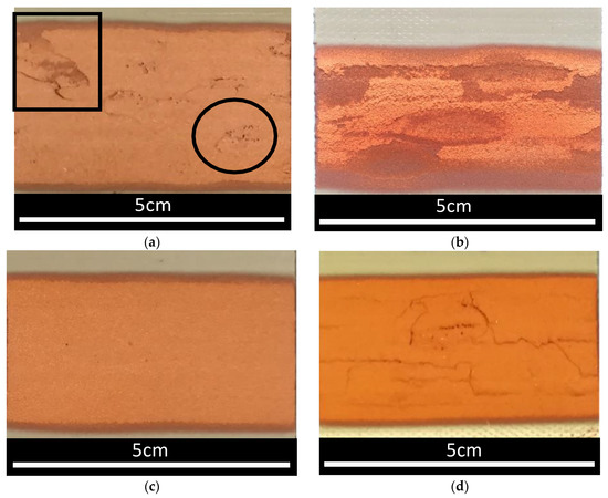 Coatings obtained with deposition sets V1 (a), V2 (b), V3 (c), and V4 (d). Typical traces of delamination as illustrated inside the black box and black circle on the figure (a).