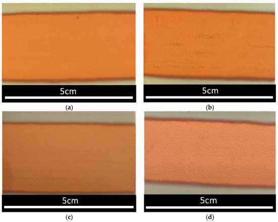 Coatings obtained with deposition sets V5 (a), V6 (b), V7 (c), and V8 (d).