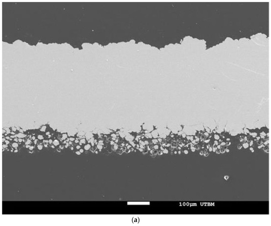 A typical onset of relevant processing conditions consists of the following settings: gas pressure, gas temperature, SoD, and nozzle transverse velocity of 30 bar, 300 °C, 105 mm, 100 mm/s, respectively, denoted as the condition set V1. The DE was found to be 67% and this limited value was due to the cumulative effect of gas temperature and transverse speed. As the gas temperature helps in softening the PEEK substrate properties (Tglass = 150 °C), the powders easily penetrate and later anchor after cooling, but some powders have low impact energy due to their low velocity, resulting in erosion and slight delamination (Figure 3). Since higher powder velocity can be achieved by increasing the gas temperature, condition set V2 (30 bar, 400 °C, 105 mm, 100 mm/s) was deployed but resulted in a limited DE of 30% due to a delamination. The upcoming particles (with much higher velocity) caused a peeling effect. Increasing the SoD from 105 mm to 120 mm (condition set V3: 30 bar, 400 °C, 120 mm, 100 mm/s) enables a DE of 53% with less erosion. The higher SoD reduces the thermal exposure of the substrate, but, at the same time, it also reduces the powder velocity. To avoid such erosion, reducing the sizes of the particles helps in achieving higher powder velocity. A low particle size range (15–33 µm) was used under the condition set V4 (30 bar, 400 °C, 120 mm, 100 mm/s, Cu-15–33 µm), which resulted in higher DE of about 83%. However, because of a delamination followed by a coating re-formation, there was an irregular coating growth (Figure 3c). Such a bad coating can be improved by reducing the amount of powder arriving in front of the substrate, that is, by a slight increase of the nozzle transverse speed to 200 mm/s (set V5: 30 bar, 400 °C, 120 mm, 200 mm/s, Cu-15–33 µm), which produces a better coating (Figure 4a), with a DE of about 87%. Using set V6 (30 bar, 500 °C, 120 mm, 200 mm/s, Cu-15–33 µm), with an aim to further to increase the powder velocity via the high gas temperature of 500 °C, the DE increased slightly to 88% but there was delamination on a few areas of the substrate (Figure 4b). Increasing the SoD to 135 mm (set V7: 30 bar, 500 °C, 200 mm/s, 135 mm, Cu-15–33 µm) improved the DE to 90% but slight erosion was observed (Figure 4c), even though the coating was thick (Figure 5). A final condition set, V8, using a higher nozzle transverse speed of 300 mm/s (30 bar, 500 °C, 135 mm, 300 mm/s, Cu-15–33 µm), enables the optimization of the DE up to 91% with good deposition without any apparent traces of erosion or delamination (Figure 5a), and with the formation of a thick coating (Figure 5b). Compared to various studies reported in the literature [27,28,29], such a DE level of 90% reveals the possibility of reaching an excellent DE by tuning the deposition parameters as revealed in this study. It is impossible to obtain a metallic coating on PEEK with a 100% DE due to the erosion during the first passes.
