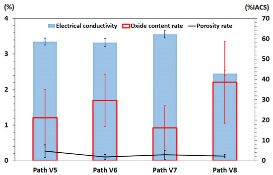 Electrical conductivity, porosity rate, and oxide content of the Cu coating produced by paths V5, V6, V7, and V8.