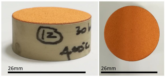 Typical continuous Cu coating onto a cylindrical PEEK substrate (diameter of 26 mm and thickness of 10 mm), obtained with 5 deposition passes with the parameters of 30 bar, 400 °C, 135 mm, and 200 mm/s.