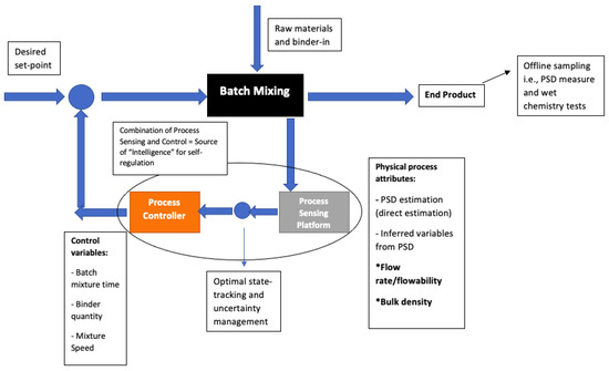 Prior work on particle sizing has been investigated by the author in regards specifically to a heterogenous-batch-powder-mixing process with a broad particle size range of 53–1500 microns, where given the nature of the process alongside the stakeholder requirements, a down-selection of the sensing instrumentation options was considered, and the problem of PSD estimation was investigated as part of a series of benchtop experiments involving both homogenous and heterogenous powder mixtures in a broad range of sizes [27,28,29]. Despite the results obtained from those series of experimental case studies and experiments, the string of related research can be said to have capably investigated the particle sizing problem without further notes and interfacing of the design PSD estimation approach on the wider system at large, i.e., control strategy and system implementation. Thus, using the related heterogenous-powder-mixing process as the process control case study of interest, this paper investigates the consideration of a self-regulating cybernetic system for control of a powder-mixing process with emphasis on the sensing and signal processing as it relates to PSD estimation, as well as avenues for dealing with estimation uncertainties due to the stochastic and non-linear behavior of the particles, associated control strategy and an overview of the benefits and implications of the framework on the sample process plants and beyond. The practical significance of the study is a roadmap that will allow for the required knowledge and tools towards the application of a self-optimizing system, which is also capable of inferring the quality of the in-process material that produces a highly stochastic signal.