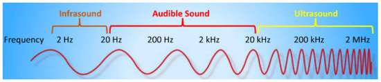 AE refers to mechanical displacement waves which mostly travel in a parallel or perpendicular direction. For the process being considered in this case study, sources of AE events are expected to emanate from the powders striking the walls of the mix drum during mixing and therein particle-structure contact, where the internal structure of the mix drum serves as a form of waveguide [28,76,77]. As part of impact generation for structural borne AEs, elastic waves are generated which travel in a mixture of directions [27]. For infinite media such as waveguides made from aluminum, a unique and additional wave exists, which is referred to as Lamb waves, where the magnitude of the AE events produced from events from these media depend upon the modes of the waveguide themselves [77,78]. From Figure 3, it can be seen that there are bands within the AE spectrum where audible sound tends to be between 20 Hz–20 KHz, and the ultrasound region spans everything thereafter [79]. The ultrasound region would be the region of use and emphasis for the proposed cybernetic system due to its being in the frequency region from which particle events are thought to emanate from.