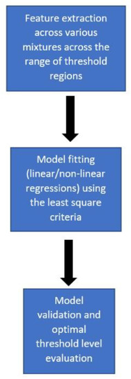 Following the tuning of the thresholds, the subsequent steps involved in the selection of the optimal threshold region of the signal include feature extraction of the signal under various mixture ratios, followed by the fitting of regression curves (linear/non-linear) and, finally, model validation using unseen data which is separate from that which was used in the training of the model. A flow diagram of this can be seen in Figure 4.