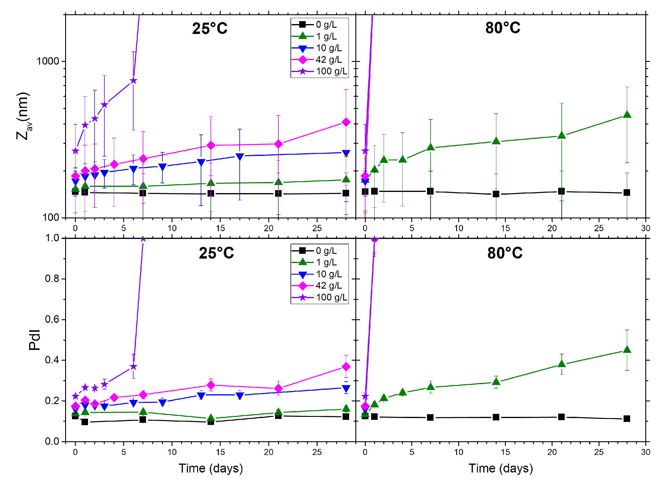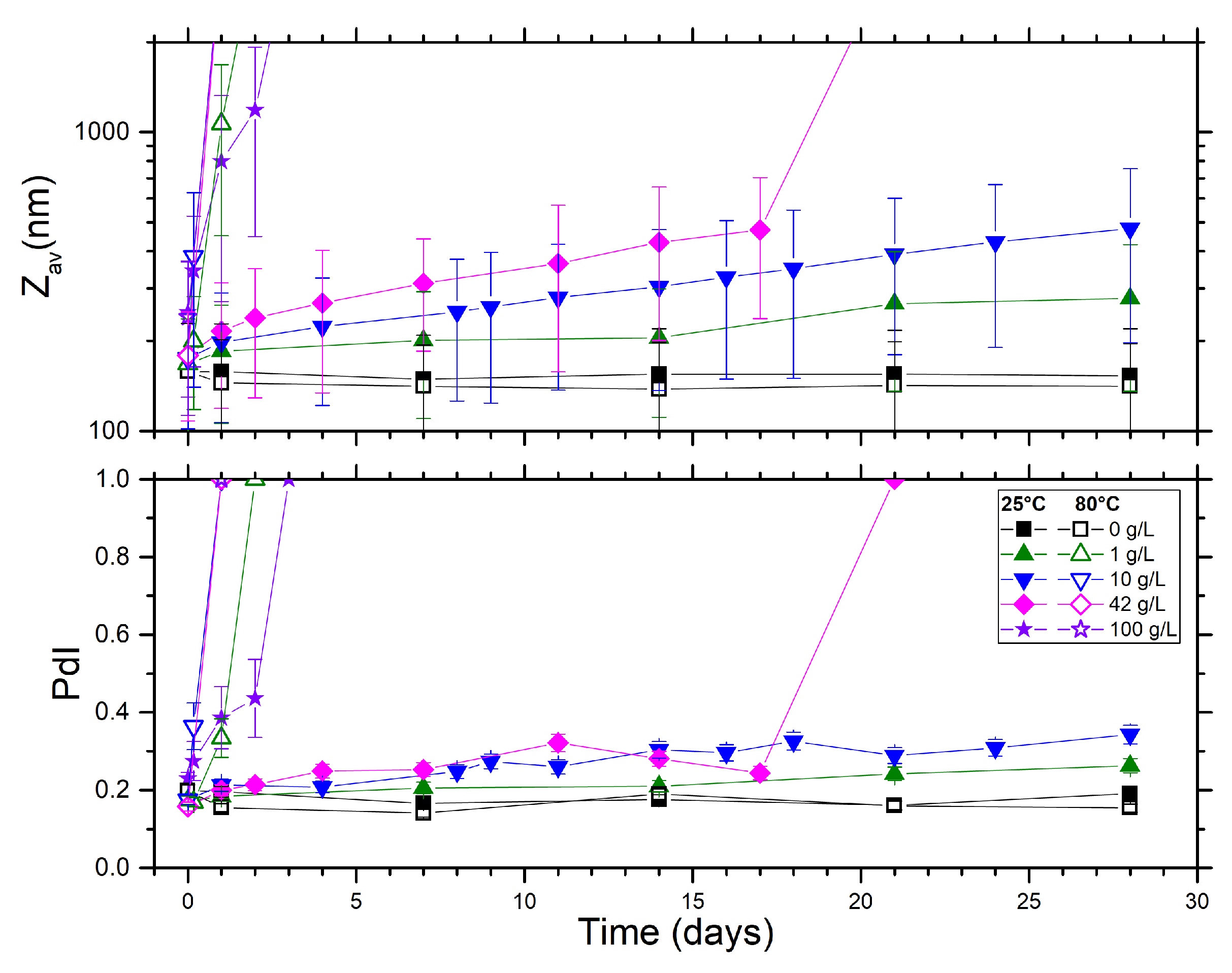13]. The counterions in electrolytes have a screening effect, which reduces the electrostatic repulsion by offsetting the surface charges. The type of salt and its divalence are key parameters for the stability of the nanofluids: multivalent salts have a stronger shielding effect than monovalent salts. For example, nanoparticles in contact with seawater are always more unstable than