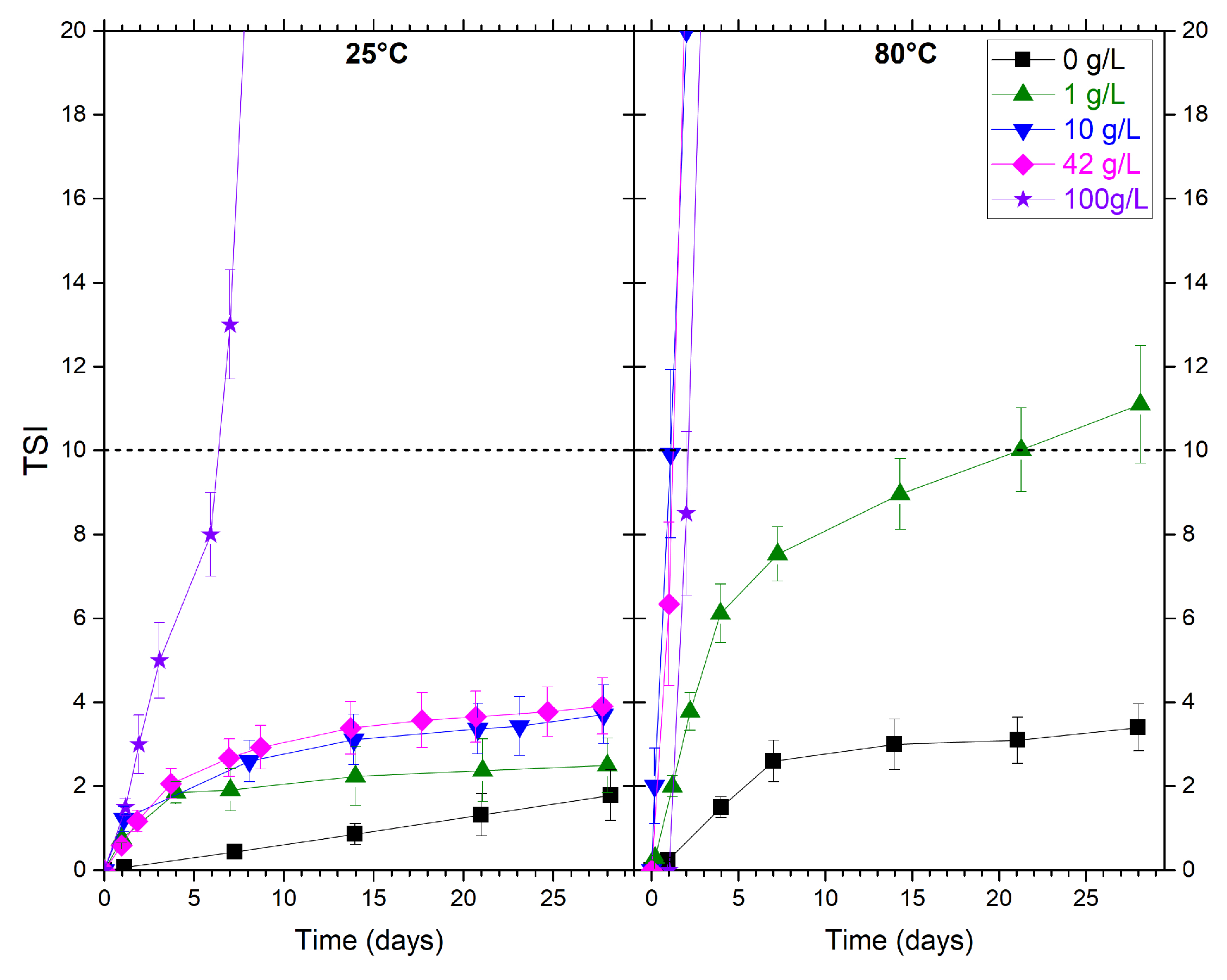 A simple solution that was considered and tested was to adjust the pH of the base fluid. However, increasing the pH to basic values to increase the negative charge of the silica particles and thus maximize the electrostatic repulsive force does not work at high ionic strengths. The results showed that working at an acidic pH close to IEP intensifies the hydration repulsion between the silica particles and stabilizes them even in seawater at 80 °C. The concentration of nanoparticles is another important parameter to take into account: the higher the concentration, the less stable the nanofluid will be over time.
