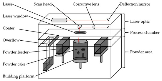 Selective laser sintering (SLS) is a powder-based additive manufacturing process in which components are generated by applying layers and selectively solidifying primarily polymer materials by using heat [1,2,3]. Figure 1 shows the structure and subdivision of an SLS system. During the SLS process, the temperature of the powder bed should be kept constant between crystallization and melting temperature (sinter window) [1,4,5]. Due to the need for a sinter window for successful processing, only semi-crystalline thermoplastics are processed [1,5]. The following cooling process is controlled to avoid rapid recrystallization and to promote the coalescence of the molten powder [4,5,6]. Too-fast recrystallization of the materials leads to a reduced dimensional accuracy of the components due to the occurrence of deformations and curling effects [4,5]. Furthermore, the printing result is influenced by the choice of process parameters such as laser power, hatch distance, layer thickness, and scanning speed. Taking into account minimal distances between the components, the building platform can be fully utilized. The surrounding, non-solidified residual material can be reused [1,5]. In addition to the printing process, the complete SLS process also includes other steps such as pre-processing and post-processing [1,2,3,5].