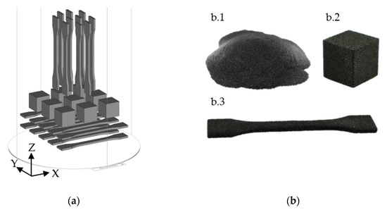 Illustration of the designed build job for the Sintratec S2 laser sintering system: (a) Orientation and placement of the test specimens in the building platform. The XYZ-specimens were oriented horizontally and the ZYX-specimens were oriented vertically. The coating direction was in the X-direction and the layer build-up in the Z-direction; (b) macroscopic images of sinter material and test specimen: (b.1) printing powder or aged powder; (b.2) cube; (b.3) tensile bar.