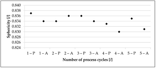 Influence of cyclic reuse on the sphericity of the used polyamide 12 sinter material. Five process cycles were considered. The printing powder (P) and the aged powder (A) were analyzed respectively. The refresh rate was 30 wt%. Determined with Camsizer XT.