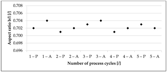 Figure 3 and Figure 4 illustrate the influence of cyclic reuse of the sinter material on its sphericity and aspect ratio. The sphericity decreased, starting from the printing powder of the first cycle (0.837) to the aged powder of the last cycle (0.831), by approx. 0.7%. In addition, the sphericity of the aged powder was lower than the sphericity of the printing powder at almost every process cycle. In contrast, the aspect ratio of the printing powder of the first cycle (0.702) to the aged powder of the last cycle (0.702) did not change in the measurable range. The maximum aspect ratio was 0.704 (1–A and 3–A) and the minimum aspect ratio was 0.701 (2–P and 4–P). Although there was a variation of approx. 0.2% between the process cycles, the aged powder of the last cycle had the same aspect ratio as the starting powder.