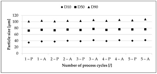 Figure 5 illustrates that the particle size increased with the increasing number of process cycles. The base material showed a D10-value of 34.4 µm, a D50-value of 72.1 µm, and a D90-value of 101.3 µm. Starting from the printing powder of the first cycle to the aged powder of the last cycle, the D10-value increased by approx. 22% (42.0 µm), the D50-value by approx. 5.8% (76.3 µm), and the D90-value by approx. 6.5% (107.9 µm). According to this, the fine particle fraction was especially reduced through the cyclic reuse and the PSD shifted towards higher particle sizes. Furthermore, the particle size of the aged powder after each process cycle was higher than that of the corresponding printing powder.