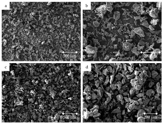 SEM images of the particles of the used polyamide 12 sinter material: (a,b) before the first process cycle at 46× and 150× magnification; (c,d) after the fifth process cycle at 46× and 105× magnification. Generated with Tescan Mira 3. Various particle agglomerates were visible in the powder after the fifth process cycle, with diameters up to 250 µm. In particular, small particles agglomerated to larger particles.