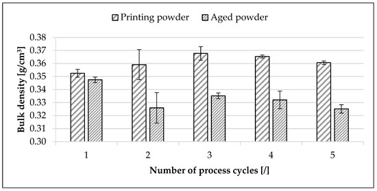 The deformation and damage of the particles recorded in Figure 6, together with the increase in particle size shown in Figure 5, affected the density of the powder in the cyclic reuse (Figure 7 and Figure 8). The arithmetic mean values of bulk and tap density shown in Figure 7 and Figure 8 had low variation coefficients of less than 5%. Furthermore, the printing powder had at least a stagnation of the bulk and tap density independent of the number of process cycles. Therefore, the selected mixing parameters seemed to be suitable regarding the homogeneous mixing of the powder fractions. The decrease in bulk and tap density of the aged powder with the increasing number of process cycles has been confirmed by various studies [63,64,65,67,69,70], which note a direct influence of particle shape, particle size, and PSD on the flowability of powders particles. The increasing ratio of the bulk and tap density of printing powder to aged powder with the increasing number of process cycles was due to both the refreshment and the increasing influence on the already recycled fractions.