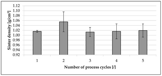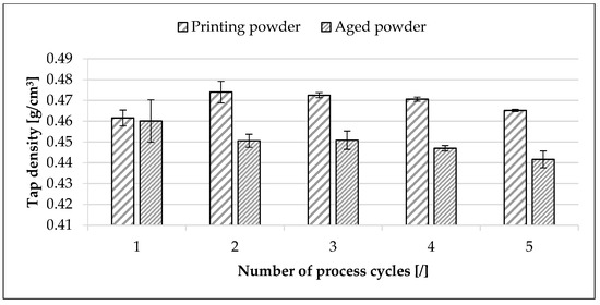 Figure 7 and Figure 8 illustrate the influence of cyclic reuse on the density of the powder. The bulk density and tap density of the aged powder decreased with the increasing number of process cycles. While the bulk density of the aged powder decreased by approx. 6.5% within five process cycles, the tap density of the powder decreased by approx. 4%.