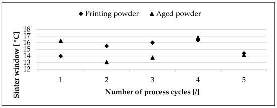 Contrary to previous studies [64,69,71,72,73,74,75,76], no measurable increase in the sinter window as a result of cyclic reuse was recorded in the DSC analysis (Figure 9). Only in the first process cycle from the printing powder to the aged powder could this influence be determined. However, the sinter window scattered within the investigation, so no clear tendency was identifiable. The reason for this was possibly the overlapping of the material aging due to the constant refreshing with new powder as well as the number of investigated process cycles, which represents an insufficient aging period.