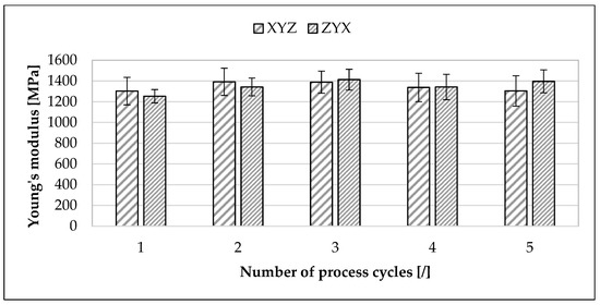 In the first cycle, Young’s modulus for the XYZ-specimens (1302.45 MPa) was approx. 3.8% higher than Young’s modulus for the ZYX-specimens (1253.00 MPa). In the fifth cycle, Young’s modulus for the XYZ-specimens (1304.04 MPa) was about 7% lower than Young’s modulus for the ZYX-specimens (1396.52 MPa).