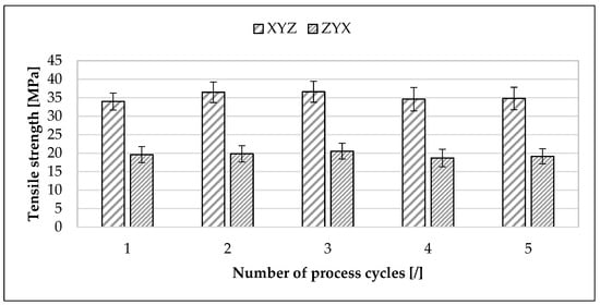 Figure 12 illustrates the influence of cyclic reuse on tensile strength. The tensile strength of the XYZ- and ZYX-specimens each decreased by approx. 2.5% within five process cycles. In the first cycle, the tensile strength of the XYZ-specimens (33.97 MPa) was approx. 42.3% higher than the tensile strength of the ZYX-specimens (19.60 MPa). In the fifth cycle, the tensile strength of the XYZ-specimens (34.80 MPa) was approx. 45% higher than the tensile strength of the ZYX-specimens (19.13 MPa).