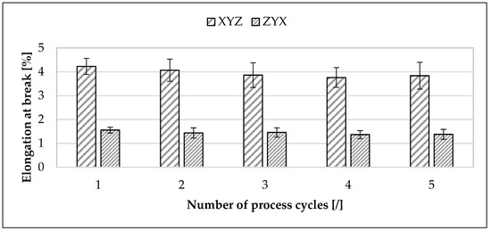 Figure 13 illustrates the influence of cyclic reuse on the elongation at break. The elongation at the break of the XYZ-specimens decreased from the first to the fifth cycle from 4.23 to 3.84%. In addition, the elongation at the break of the ZYX-specimens decreased in the same number of process cycles from 1.56% to 1.38%. During the cyclic reuse, the ratio of elongation at the break of the XYZ-specimens to the ZYX-specimens remained constant at approx. 63.5%.