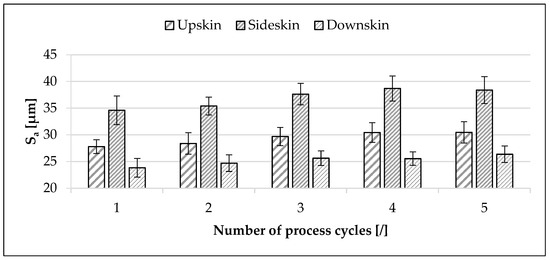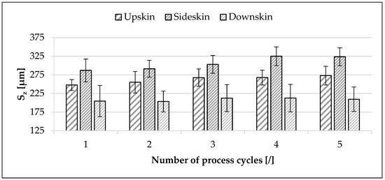 The mobile confocal microscope MarSurf CM mobile from NanoFocus AG (Oberhausen, Germany) was used to determine the surface roughness and digitize the topography. The roughness measurements carried out were based on DIN EN ISO 4287:2010-07 [59] and DIN EN ISO 25178-1:2016-12 [60]. The generated data was transformed into roughness and flatness information using the µsoft analysis extended software. The surface parameters Sa and Sz were used for the evaluation of the surface roughness due to the partially direction-dependent roughness of the surfaces [5,28,61,62]. For the analysis of the surface roughness, the cubes listed in Table 1 were used. To analyze the influence of the printing orientation on the surface roughness, the three main orientations [5,28] (upskin, sideskin, and downskin) were considered. Therefore, the measuring field was placed in the center of the cube faces. Table 3 lists the selected settings on the confocal microscope.