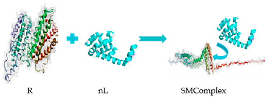 Example of a uniaxial method of mechanically unwinding a receptor protein (R) with hidden adhesion sites which become available for the ligand (nL) recognition process to form a supramolecular complex (SMComplex).