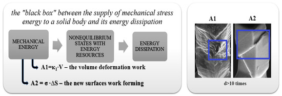 The conversion process of elastic energy, from the mechanical impact on a solid body (SB), into heat is accompanied by metastable structures with energy reserves, characterized by shifting of atoms from equilibrium stable positions in the lattice nodes, changes in length and bond angles, and the excitation of electronic subsystems [8,9]. Despite the apparent macroscopic simplicity, the transfer of mechanical energy to a solid body is very complex and occurs via multistage dissipation channels. The energy input is proportional to the volume of SB to be collapsed—work A1 or the area of the new surface formed—A2 (Figure 2).