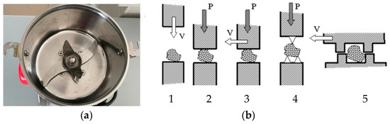 The operation principle of laboratory knife mill: (a) view of the grinding bowl inside the knife mill. (b) Techniques for applying mechanical stress to the solid body surface: 1—constrained impact, 2—crushing, 3—abrasion, 4—splitting, 5—cutting, where P is mechanical force; V is shear direction.