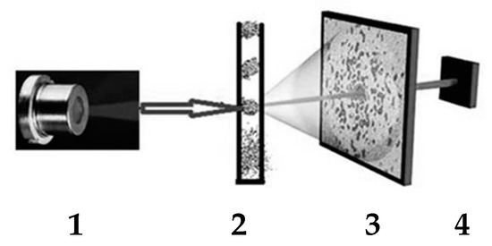 The optical set-up of dissolution rate kinetics design: 1—632.8 nm He-Ne laser; 2—capacity cell with examined disperse system; 3—diffraction pattern; 4—detector.