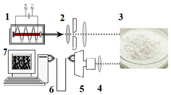 Experimental scheme of a 2D-LS setup: 1—compact emitter, 2—laser processing module, 3—test sample, 4—collecting lens, 5—charge-coupled device (CCD), 6—USB cable, 7—personal computer.