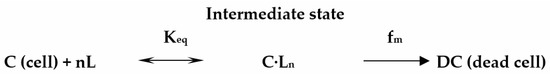 Kinetic scheme of ligand–receptor interaction of Sp. ambiguum with toxicant: C—cell, L—ligand, n—stoichiometric coefficient, C·Ln—intermediate state (cell after interaction with the ligand), Keq—equilibrium constant fast stage, fm—rate constant of the cell transition to the dead state, DC—dead cell.