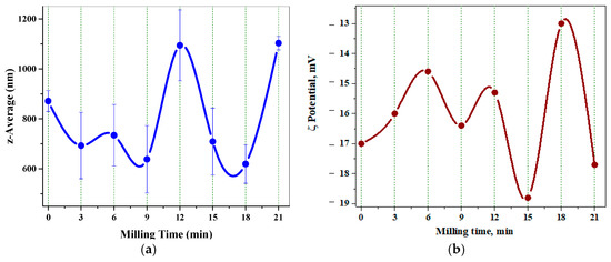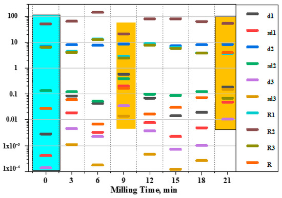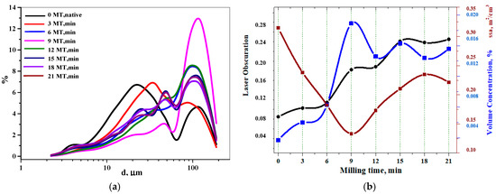 A high-intensive mechanical impact on the Lvf·Hh powder for 21 min with a maximum load of 40 g resulted in an observable dispersity phenomenon (DPh) of the test sample unloading from the milling bowl every 3 min, as measured using SLS (Figure 8).