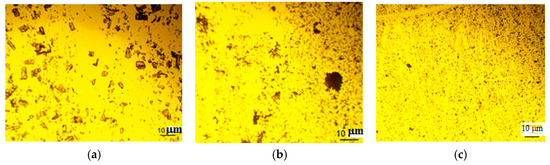 The Mact via static laser scattering (SLS) method was used to characterize particle size distribution before and after they were dispersed in n-hexan (1:200). In the particle size analysis, the size spectra (volumetric distribution on an ensemble of particles by size) was recorded using a MasterSizer 3600 Ec low-angle laser meter (Malvern, UK) [17]. The optical module of the equipment used made it possible to determine the size of the dispersed-phase particles in the range from 1 μm to 180 μm based on the measurement of the angular dependence of the intensity of the scattered laser light passing through the dispersed sample [18]. The SLS method also made it possible to determine the integral dispersion characteristics of the particles examined: laser obscuration (LO), volume concentration (VC, %), and specific surface area (ssa, m2/cm3). To obtain dimensional spectra, the distribution of the fraction of heterogeneous-phase particles was determine and then organized into dimensional groups, and this was used as a background as well as a medium to prepare the heterogeneous solution.