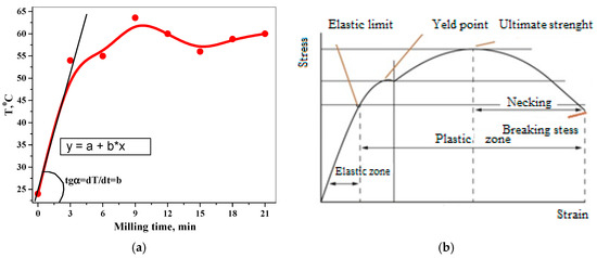 Temperature curve duration of the applied MI: (a) the heating inside the milling bowl; (b) the typical of SB stress–strain curve.