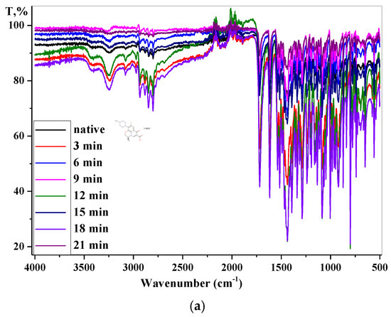 Figure 13 shows the vibrational spectra of Lvf·Hh samples before and after the performed MI in the complete and fragmented regions from 4000 to 500 cm−1 wavenumbers, reflecting the features of the ongoing changes in the levofloxacin structure from the perspective of quantum-mechanical concepts. The FT-IR spectra of the original sample Lvf·Hh (black curve) show quantum transitions corresponding to the excitation of the vibrational motion of the molecule in the anharmonic oscillator model [32].