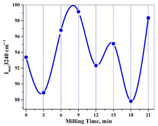 Covalent bonds deformed via high-intensity MI exhibit hyper- or hypochromic effects (increase/decrease in absorption intensity), a bathochromic shift of the maximum, and the degeneration of the vibrations, which is expressed as a complete band loss at a given frequency [33]. The start of the MI impact extends to the tensile bonds in the linear elastic region (see Figure 10), which is accompanied by an increase in absorption and band intensity across the frequency range. The dynamic observation of the O-H oscillation band at 3240 cm−1 for Lvf·Hh before and after the MI produced shows spiking, periodic fluctuations in the maximum intensity (Figure 14), similar to the results of dispersive analysis via SLS and DLS (see Figure 8b and Figure 11b).
