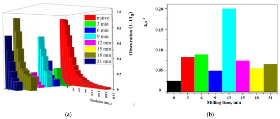 The effect of non-thermal mechanical influence on the drug powder (in the range from 0 to 21 min at a load value of 40 g) was evaluated via the DLS method based on the analysis of the autocorrelation function determined by the time-varying intensity of scattered light (Photon Correlation Spectroscopy in aqueous solutions of the test samples with different MI times (Figure 11).