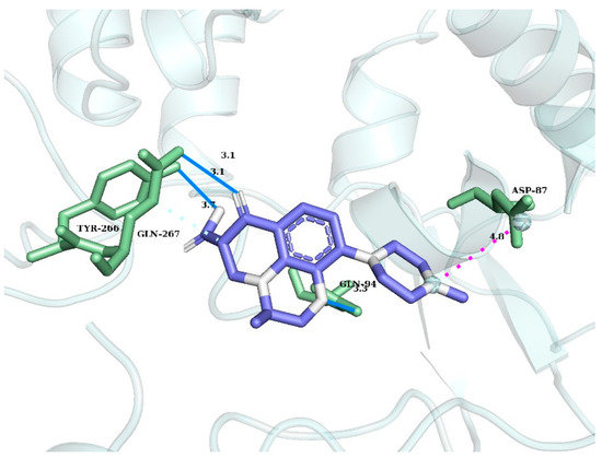 The performed structural calculations for the determination of the “pose”, i.e., the subsequent “docking” of a drug molecule with the surface of topoisomerase, allowed for the detection of those amino acid residues in the active site of the enzyme, which form intermolecular bonds with levofloxacin. Thus, interaction between an aspartic acid residue in position 87 and a fragment of levofloxacin methyl piperazine was detected (Figure 18).